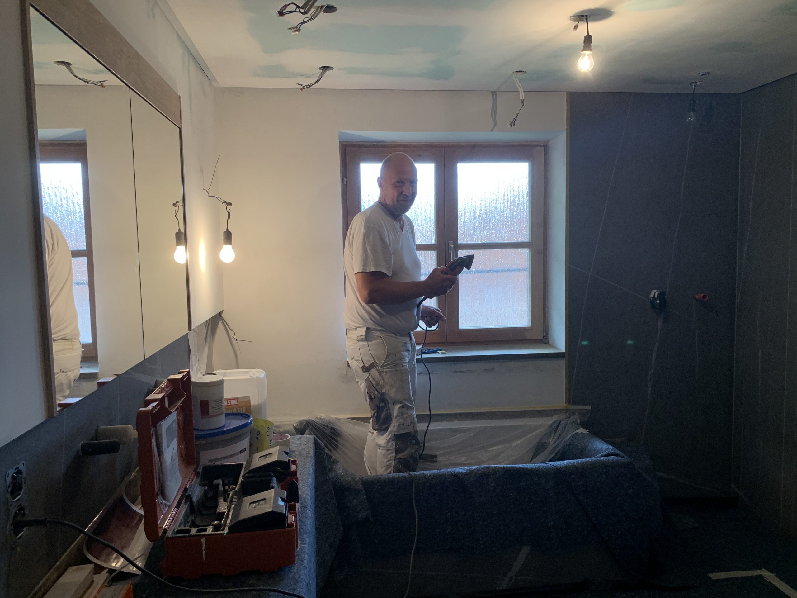 Update von der Baustelle. Oft sind es bei den Bädern nur noch kleiner Flächen, die vom Maler aufbereitet werden müssen, wie hier z.B. ein Teilstück von der Wand, und natürlich die Decke. Aber dennoch ist es eine sehr wichtige Arbeit, die getan werden muss.