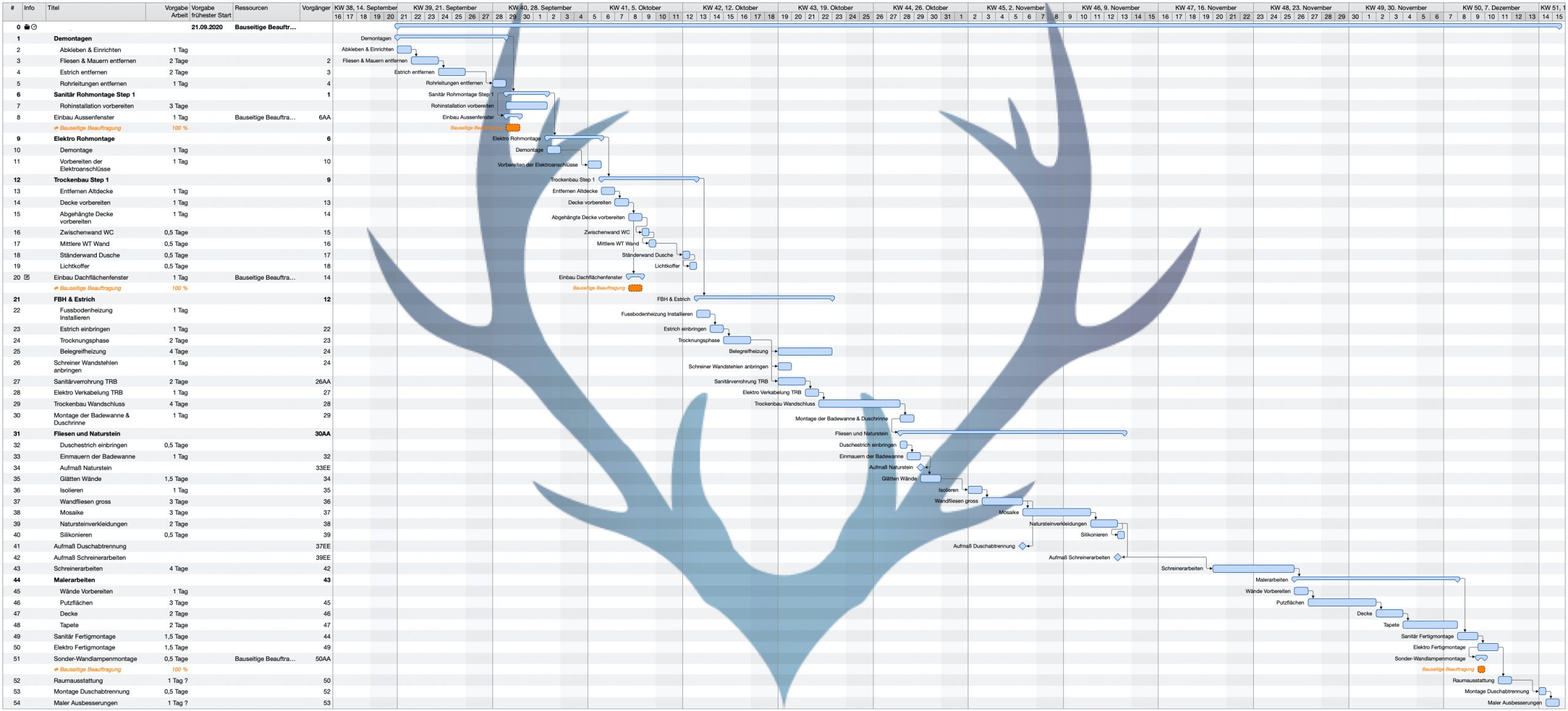 Daß wir, von der Tegernseer Badmanufaktur, durchaus ausgefeilte und einzigartige Bäder planen, können Sie anhand unserer Referenzen gut ersehen. Da wir jedoch auch öfters gefragt werden, wie wir die einzelnen Handwerker koordinieren, möchte ich Ihnen ein Beispiel zeigen. Wir planen die Bauzeitenplanung, ebenso wie unsere Ausführungsplanungen, sehr Detailliert und punktgenau. Von der ersten Demontage bis zum letzten Handgriff des Raumausstatters. Dies kann bei grösseren Projekten, wie diesem hier, durchaus so aussehen.